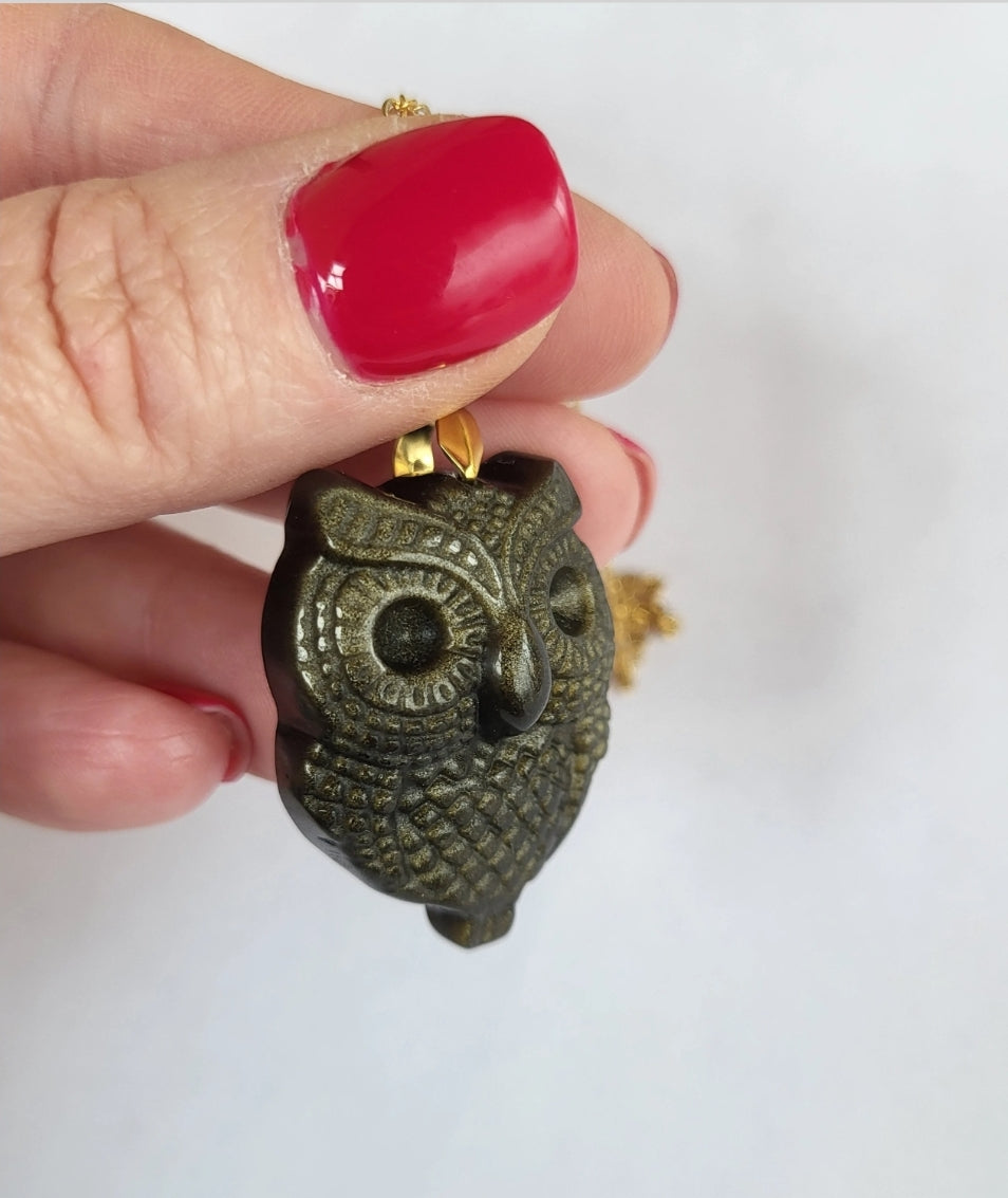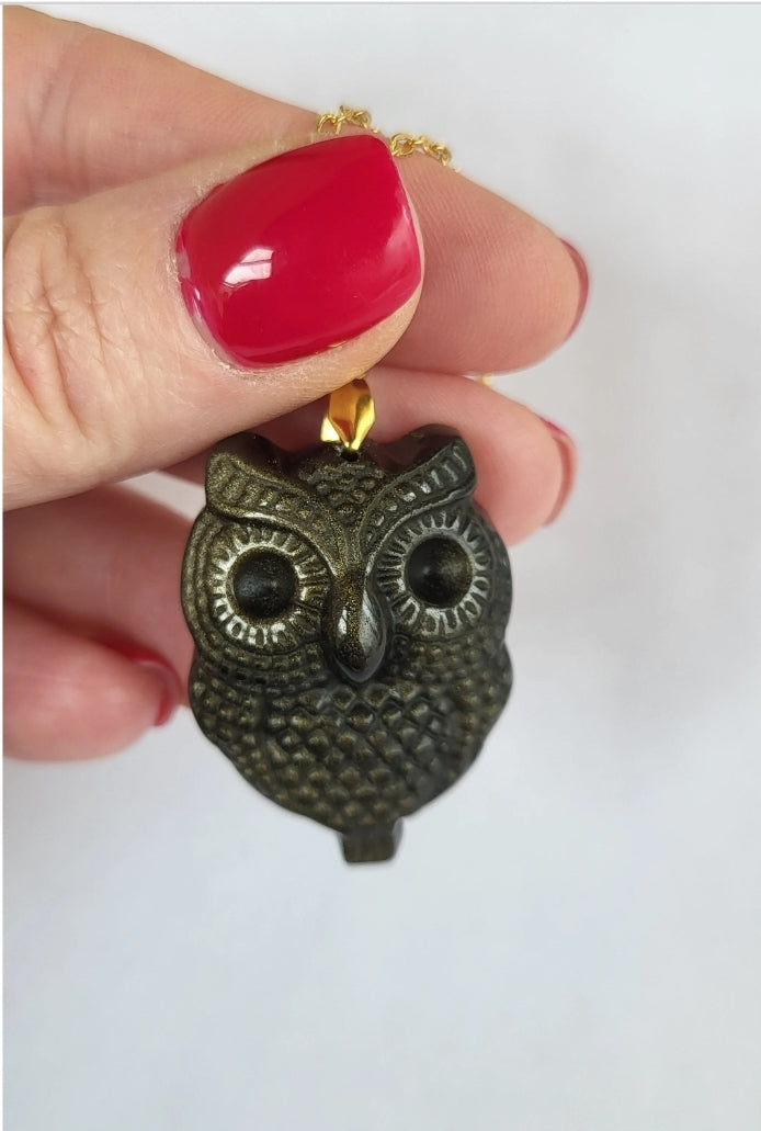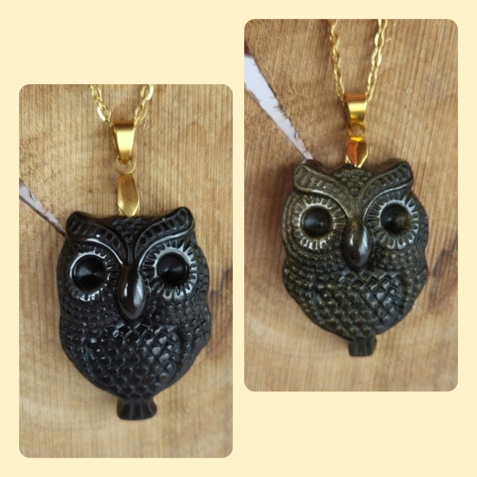 Collier avec pendentif chouette en obsidienne dorée ou obsidienne oeil céleste