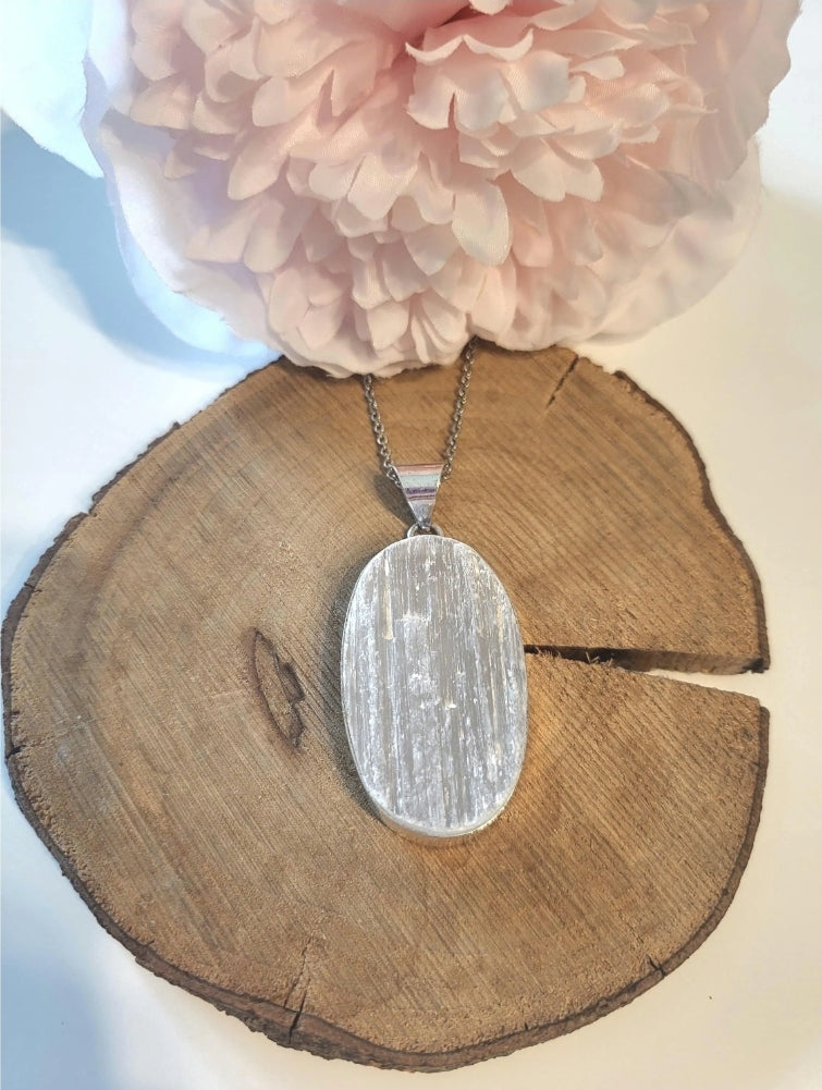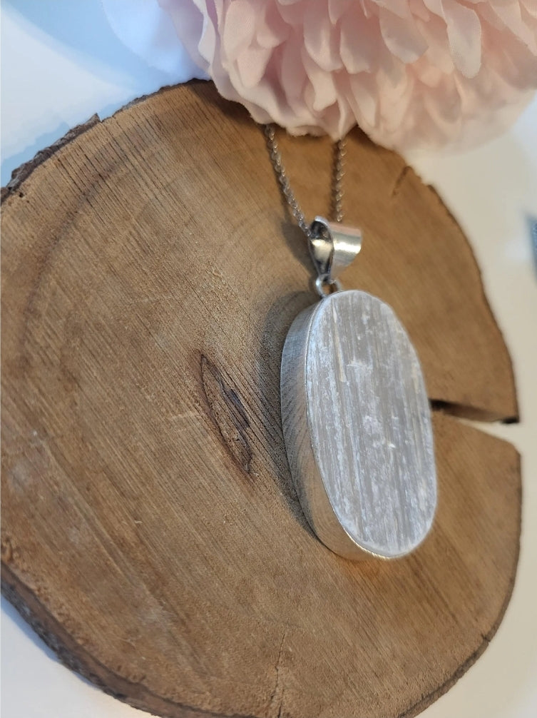 Collier avec chaine en acier inoxydable argenté de 45cm et pendentif en sélénite