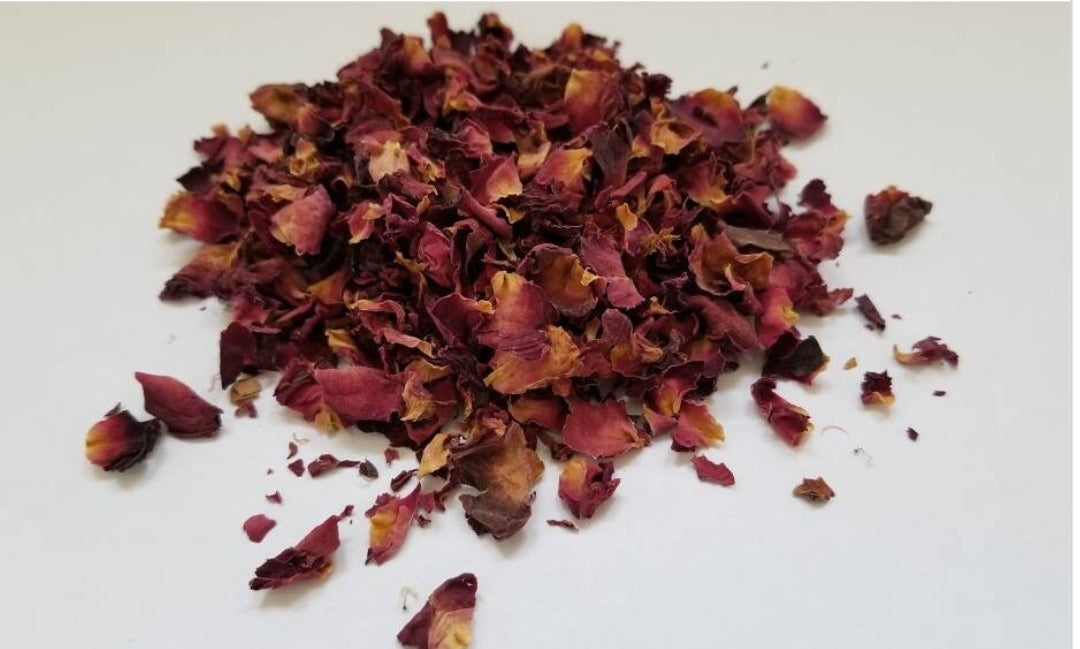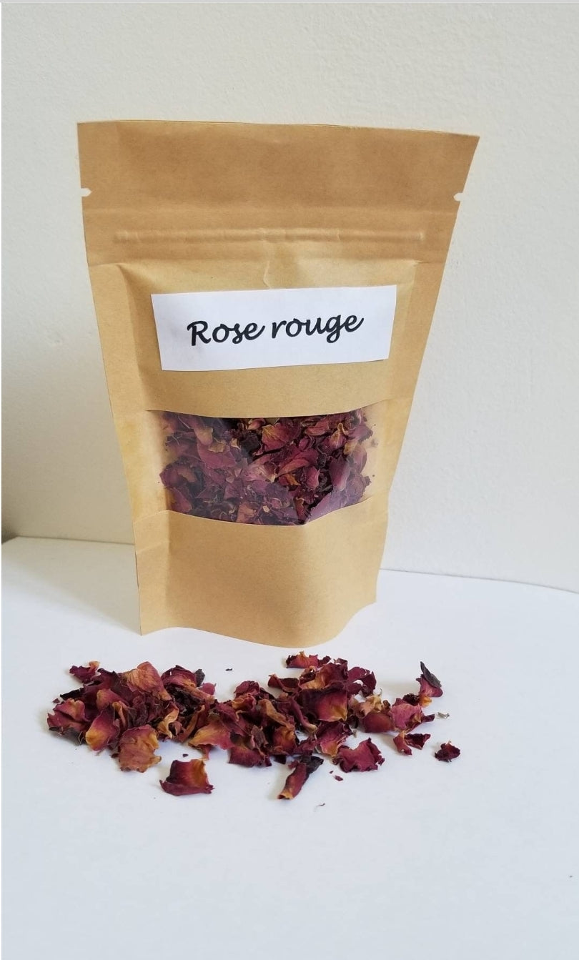 Sachet de pétales de roses rouges séchées pour rituels, bains ou décoration.